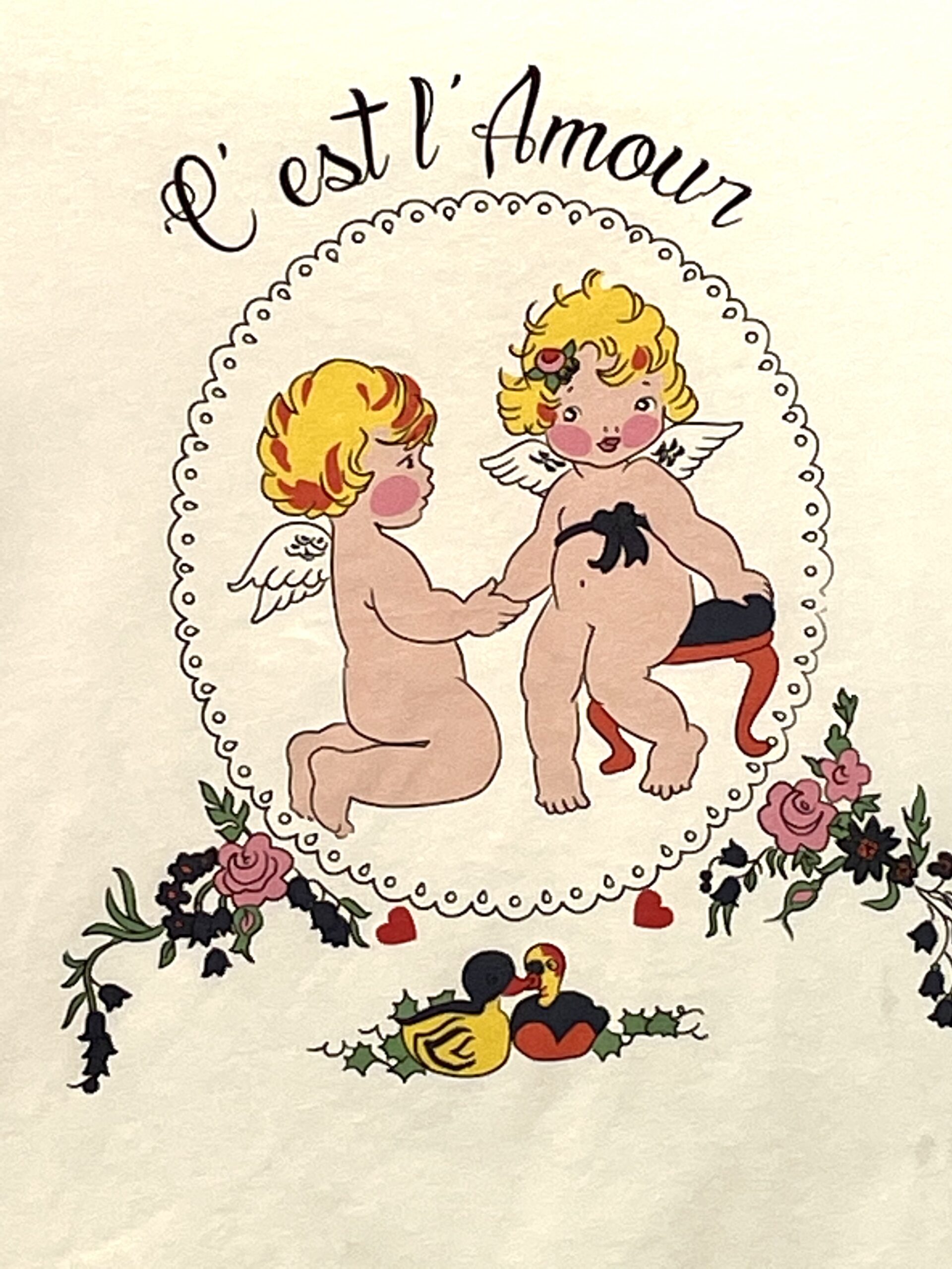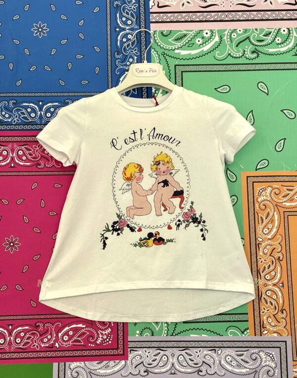 in cotone con stampa angioletti e fiori.