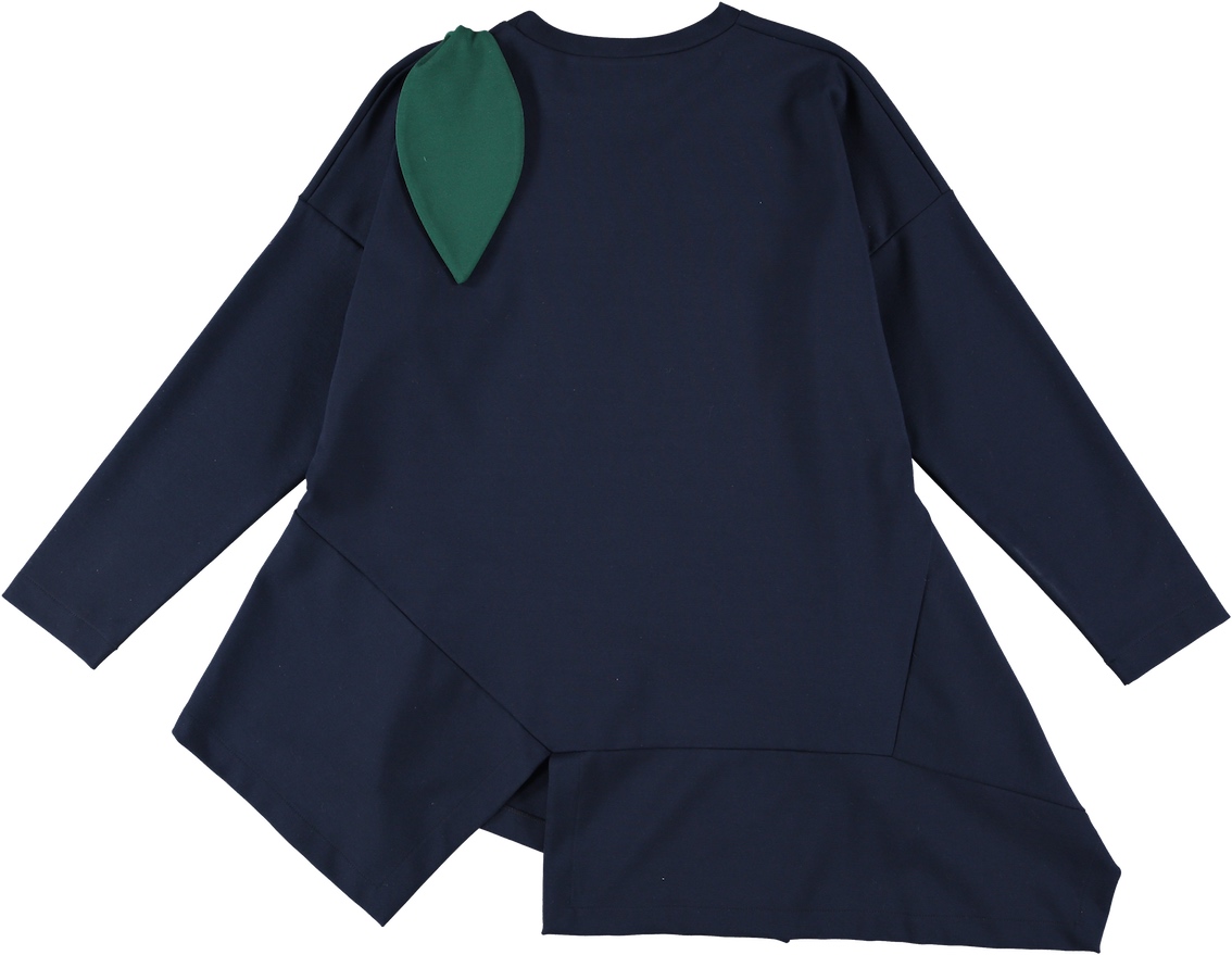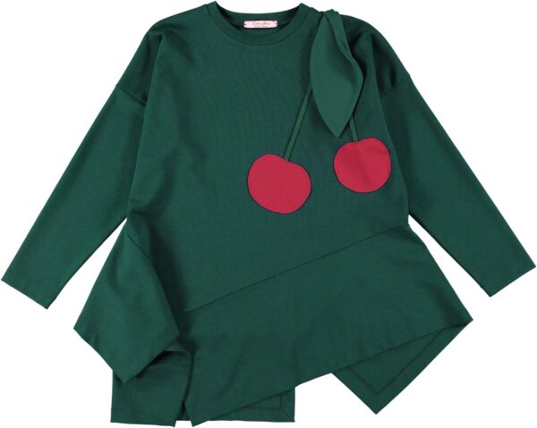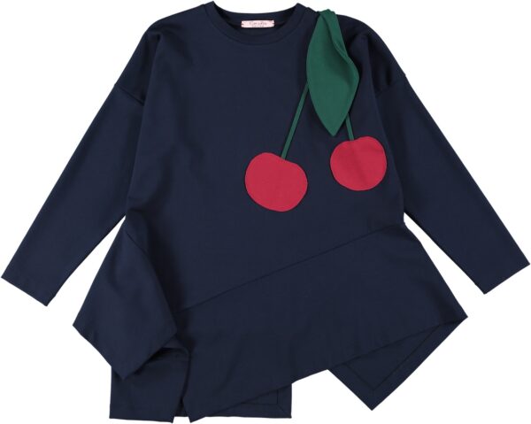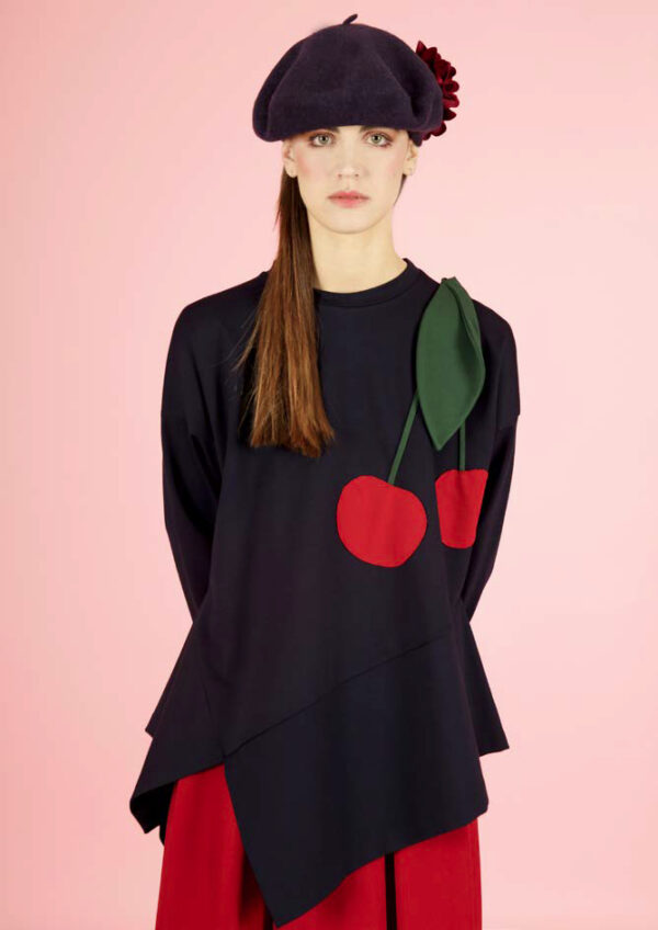 Blusa in punto milano con balza asimmetrica a taglio vivo e ciliegia applicata