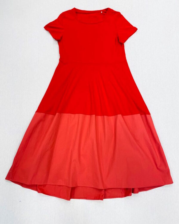 Abito in jersey di cotone elasticizzato a manica corta svasato con balza in popeline