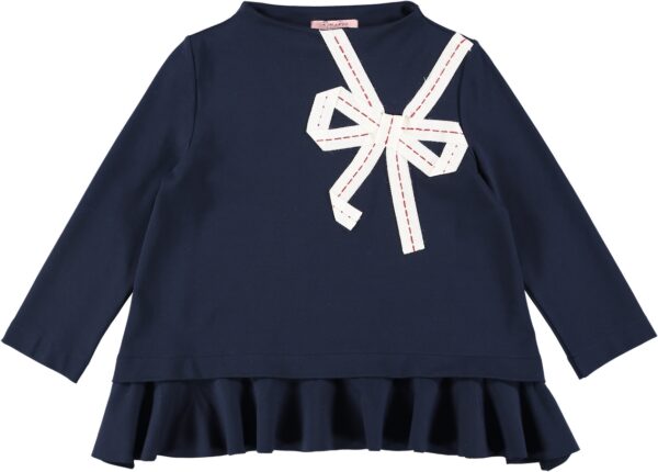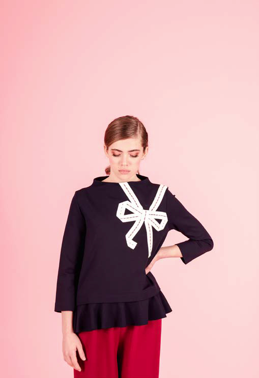 Blusa in punto milano con collo ad imbuto e motivo fiocco applicato